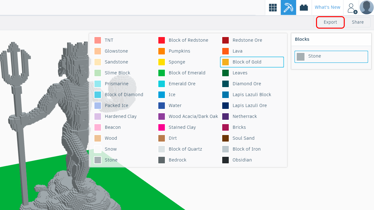 After choosing it size, you tin also select the blocks of which our model will be made of. Finally, we tin consign our model to Minecraft'south uniform format, .schematic.